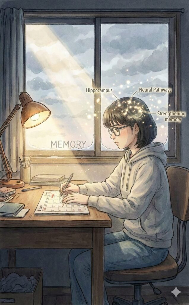 繰りかえす流水が渓谷や河川の形成過程に関わるように、記憶は繰りかえす知覚がこれの生成と強化に強く関わる。反復される情報伝達が記憶の水路を形成して将に記憶回路を作る。河川の支流が降雨の繰り返しで増える事実に似て、脳神経科学的に言えば想起に関わる脳神経信号の伝達が容易くなるように神経回路網が構築される。