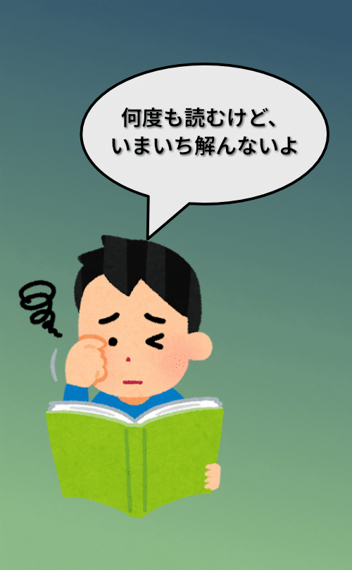 いずれにしても、参考書や解答解説を誤解でなく読解する為に有用な行為は出力(自分の言葉で具体的に説明したりテストしたり)することだった。この結果が検証して正しくなければ読解をやり直す。正しければ次の読解に進む。勿論、直線的に進むことはない。三歩進んで二歩さがることもある。地道にコツコツ取り組まれたい。